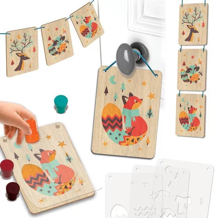 Un coffret créatif pour découvrir la tampographie sur bois. Ce kit permettra à l'enfant de dessiner facilement sur de belles planchettes en bois. Grâce à la technique des pochoirs (un pochoir pour chaque couleur) les tableaux seront réussis à tous les coups. En utilisant la cordelette fournie les chefs-d'œuvre des enfants pourront-être exposés dans toute la maison ! Contient 3 planchettes en bois, 3 jeux de pochoirs pour dessiner 3 personnages, 4 applicateurs de couleur et une cordelette pour accrocher les tableaux individuellement ou tous ensemble.
